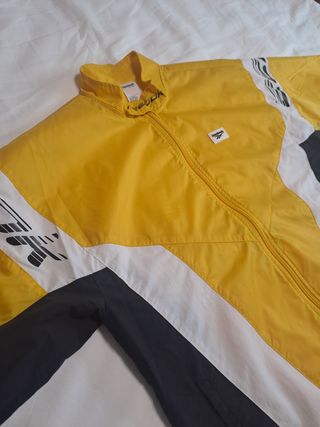 Chaqueta deportiva con un diseño moderno y llamativo. - Talla S, pero vale como talla M - Paneles de color amarillo, blanco y negro. - Logo de Reebok en el pecho. - Cierre de cremallera frontal. - Cuello alto.