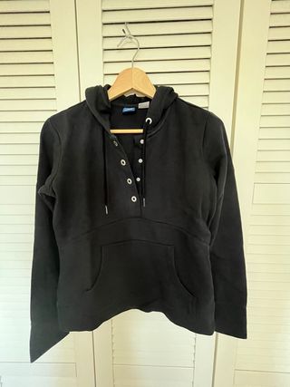 Sudadera con capucha y botones en la parte delantera. Un básico para tu armario. - Capucha ajustable con cordones. - Bolsillo tipo canguro. - Puños y bajo elásticos.