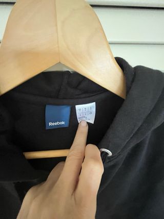Sudadera con capucha de la marca Reebok, es color negro. Talla L, medidas añadidas para más aclaración. Tiene un enganchón en un brazo, a la altura del hombro, foto 5. Puede tener pelitos de gato. ENVÍOS POR WALLAPOP O RECOGIDA EN PLAZA CASTILLA.