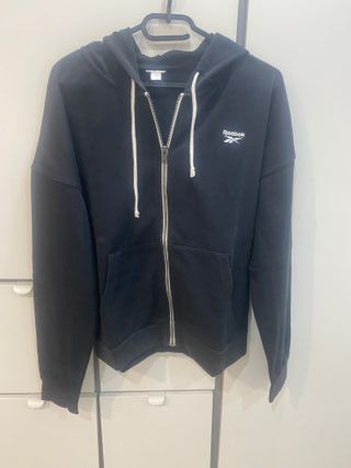 Sudadera REEBOK con capucha y cremallera completa. - Logo de Reebok bordado en el pecho. - Bolsillos frontales tipo canguro. - Cordones blancos para ajustar la capucha. - Color negro, talla L - Puños y bajo acanalados.