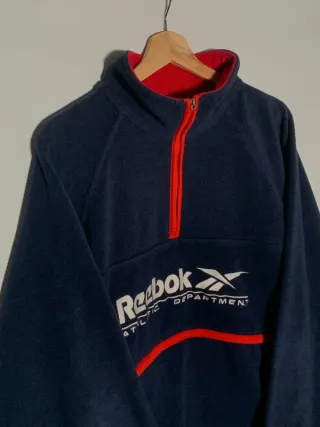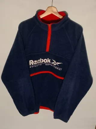 Sudadera deportiva de manga larga con media cremallera. - Diseño en color azul con detalles en blanco y negro en las mangas. - Logo de Reebok bordado en el pecho.