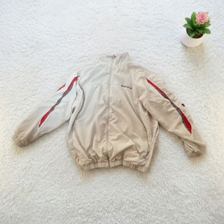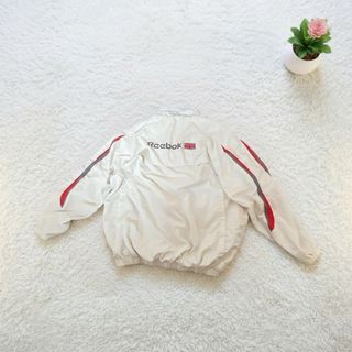 Chaqueta cortavientos de estilo vintage de la marca Reebok, inspirada en la moda de los años 90. Su diseño combina tonos beige con detalles en rojo y gris en las mangas. - Cierre de cremallera frontal. - Cuello alto. - Puños y cintura elásticos.