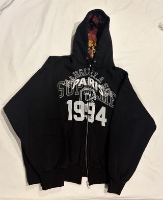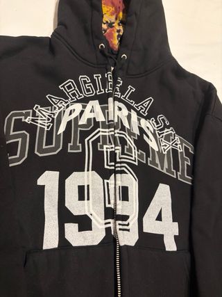 Sudadera con cremallera de la colaboración entre Maison Margiela y Supreme. - Diseño frontal con texto Margiela Paris Supreme 1994. - Capucha con forro estampado. - Cremallera completa.