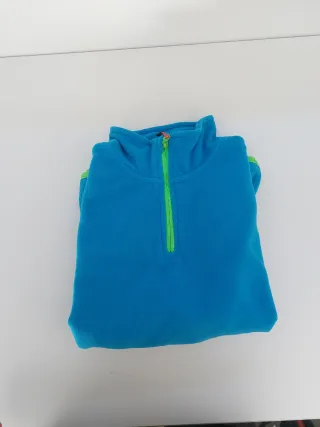 Jersey térmico de color azul con detalles en verde y cremallera. Es de niños 11-13 - Cremallera frontal. - Cuello alto.
