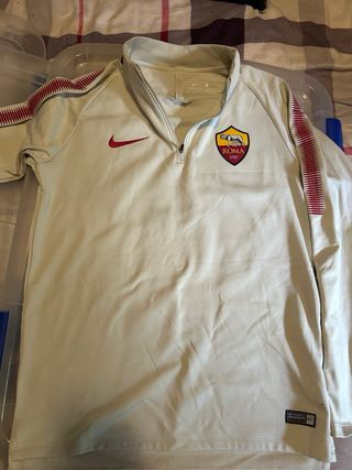 Sudadera técnica de entrenamiento del AS Roma. -Producto oficial - Diseño Dry Fit para mayor transpirabilidad. - Escudo del equipo bordado en el pecho. - Detalles de rayas rojas en las mangas. - Espacio para sacar los pulgares. - Forro polar por dentro.