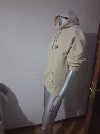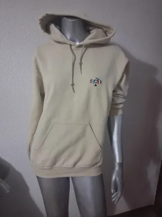 Sudadera color crema con capucha, térmica. - Talla: S - Medidas: 50 cms de sisa, 65 cms de largo. - Textura interna térmica. - Bolsillo canguro.