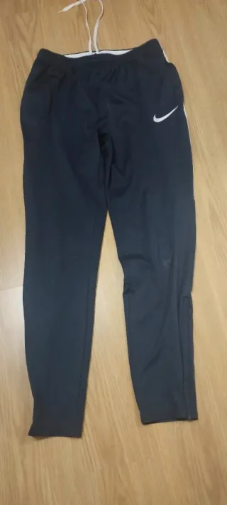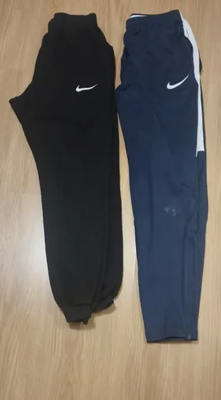 Conjunto de dos pantalones deportivos Nike. - Un pantalón de color negro.Algodon con puños y bolsillos laterales. Cintura de goma le falta el cordón - Un pantalón de color azul marino con detalles blancos. Tiene roce en una rodilla ver foto pero no roto. Sudadera Decathlon térmica negra