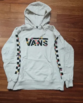 Sudadera con capucha de Vans en talla S. Presenta un diseño llamativo con el logo de la marca adornado con flores y detalles de cuadros checkerboard en las mangas. - Logo de Vans con estampado floral. - Mangas con diseño de cuadros checkerboard y flores. - Bolsillo frontal tipo canguro.