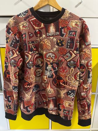 Sudadera icónica de ZARA, modelo tapestry/gobelino con diseño tejido (no estampado). Pieza especial, ya descatalogada y difícil de encontrar hoy en día. Diseño muy potente con motivos tattoo/western (águilas, leones, calaveras, rosas, dados) y textos EMOTION · GET LOST · WANDER. Tejido grueso, pesado y resistente, muy superior a una sudadera normal. Talla M. Muy buen estado, sin roturas ni defectos. Composición: mezcla de poliéster y algodón. Fabricada en Turquía.