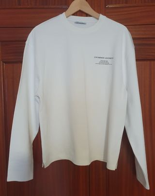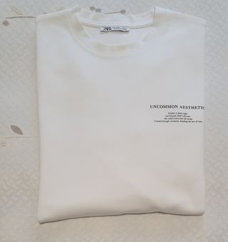Sudadera blanca de Zara con estampado UNCOMMON AESTHETIC y texto. - Estampado frontal con texto. - Cuello redondo. - Manga larga. -Medidas en fotografias.