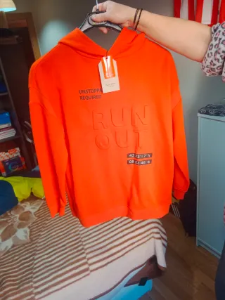 Sudadera con capucha de color naranja vibrante. Presenta un diseño con relieve y texto. - Estampado en relieve RUN OUT. - Texto adicional UNSTOPPA REQUIRED. - Coordenadas geográficas impresas: 43°22'17N 08°23'46W. - Capucha con cordones. - Puños y bajo elásticos. Talla 13/14 zara kids