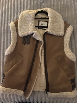 Chaleco estilo aviador de Zara con forro de borreguito. - Diseño sin mangas. - Cierre de cremallera. - Bolsillos delanteros. - Detalle de cintas en los laterales.