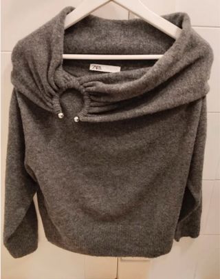 Jersey de punto fino de Zara con un diseño elegante y moderno. - Cuello drapeado con detalle de anilla metálica. - Manga larga. - Bajo con aberturas laterales.