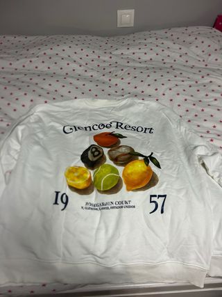 Sudadera con estampado gráfico de Glencoe Resort. - Diseño frontal con frutas y números. - Cuello redondo. - Manga larga.