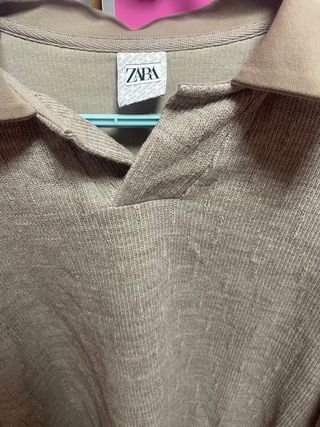 Jersey de Zara en color marrón con cuello tipo polo. Su tejido es texturizado y de manga larga. - Cuello de solapa. - Corte holgado.