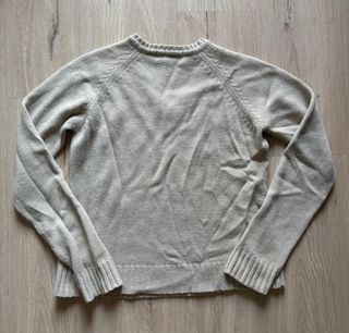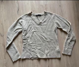 Jersey de punto fino en color beige, con cuello en pico y manga larga. Talla L. Solo se realizan ventas mediante envíos. No hago entregas en mano. Gracias. No se hacen reservas de productos.