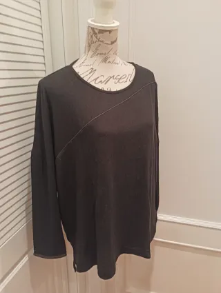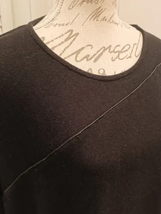 Jersey negro finito o camiseta gruesa... De tejido suave con ribete de polipiel. Es muy amplio. - Cuello redondo. - Corte holgado.