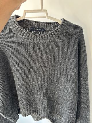 Jersey de punto gris de Zara con un diseño moderno y desgastado. - Tejido de algodón. - Corte cropped. - Acabado deshilachado en bajo y mangas.