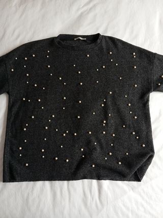 Jersey Zara, abalorios en negro y granate, punto fino con elastano, talla M justa, gris marengo