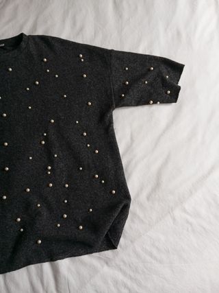 Jersey de punto fino en color gris, adornado con pequeñas perlas.Pone una Talla S pero talla como una M - Media manga - Perlas aplicadas por toda la prenda.