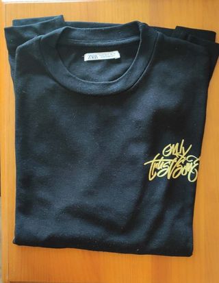 Sudadera negra de Zara con estampado. - Diseño FREE AND ORIGINAL en blanco. - Cuello redondo. - Puños y bajo elásticos. - Talla 11-12