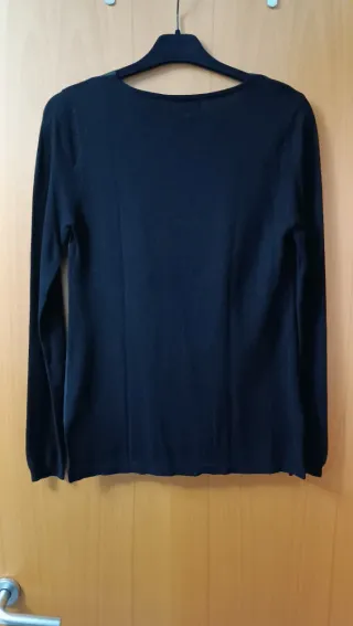 jersey de zara. el escote queda detrás. muy bonito en negro y plata. es talla M. pero queda anchito. medidas de pecho 53 cm, hombros 50 cm y largo 69 cm.