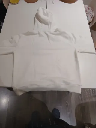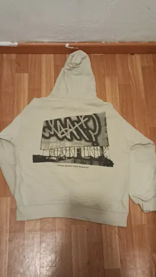 Sudadera blanca de Zara con un diseño moderno y llamativo. - Estampados gráficos en la parte delantera. - Capucha con cordones ajustables. - Bolsillo tipo canguro.