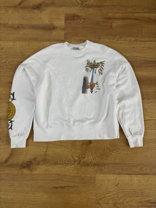 Sudadera blanca de Zara con un diseño gráfico llamativo en el pecho y en la manga. - Estampado frontal con espada y corona. - Detalle gráfico en la manga izquierda. - Cuello redondo y manga larga.