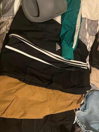 Lote de ropa variada que incluye pantalones, sudaderas y chanclas. 5 sudaderas/chaqueta x 6€ cada una 4 pantalones cargos (hanchos) x 5 cada uno 2 pantalones chandals (1 adidas) 3 pantalones cargo/slim fit x 3€ cada uno 2 cortos (medio hanchos) x 3€ cada uno 1 chanclas 0€ 1 camiseta blanca 0€ 3 sudaderas estan intactas, otras 2 en buenas condiciones. Pantalones cargos estan en muy buenas condiciones. Chandal adidas normal, otro chandal bastante usado. 3 pantalones slim buenas condiciones. 2 pantalones cortos super buenas condiciones. Chanclas casi nuevas. Camiseta blanca usada pero en buenas condiciones.