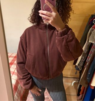 Chaqueta de felpa de Zara en color granate. Diseño moderno y cómodo. - Cuello alto. - Cierre de cremallera. - Puños y bajo elásticos.