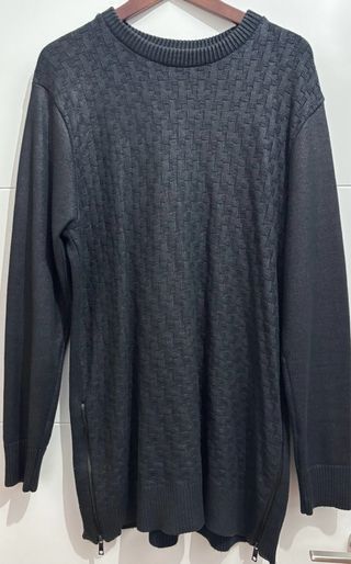 Jersey largo de Zara en color negro. Presenta un diseño tejido en la parte frontal y detalles de cremalleras en los laterales inferiores. Llega por debajo de la cintura. - Diseño tejido en el torso. - Cremalleras laterales. - Cuello redondo.
