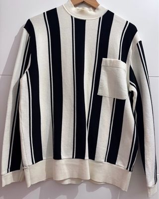 Jersey de punto con un diseño de rayas verticales en blanco y negro. Presenta un cuello redondo y un bolsillo en el pecho. - Diseño de rayas verticales. - Bolsillo en el pecho.