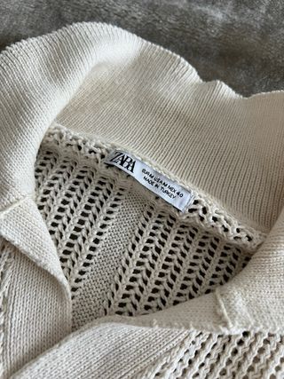 Camiseta de punto calado de Zara, con un diseño moderno y fresco. - Cuello tipo polo con abertura en V. - Tejido ligero y transpirable. - Manga larga.
