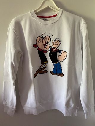 Vendo sudadera de la marca Zara. Talla M de hombre. Color blanco con estampado de Popeye & Olivia. Como nueva, muy poco uso.
