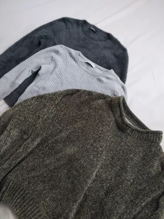 Estado: En buen estado general. Los tres jerséis han sido usados y cuidados, sin rotos ni manchas importantes. El jersey blanco presenta una mancha difuminada en azul, mil dificil de percibir. El punto se mantiene en buena forma. Pueden presentar un ligero pilling propio del uso, pero aún tienen mucha vida útil.