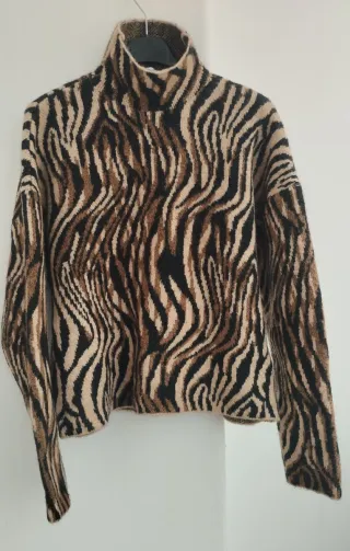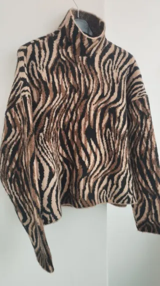 Suéter estampado tipo cebra, cuello perkins y corte oversize con hombros caidos. Es muy calentito. En perfecto estado. Medidas: Largo 54; Largo de manga desde axila 54 y ancho del bajo 43.