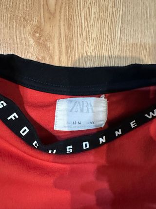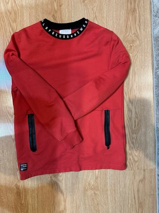 Sudadera de manga larga en color rojo de la marca Zara. Presenta un diseño moderno con detalles de cremalleras. - Cuello redondo con texto. - Dos bolsillos frontales con cremallera. - Etiqueta interior con información.