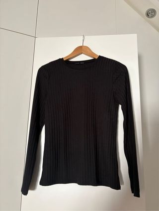 Jersey negro finito o camiseta gruesa... De tejido suave con ribete de polipiel. Es muy amplio. - Cuello redondo. - Corte holgado.