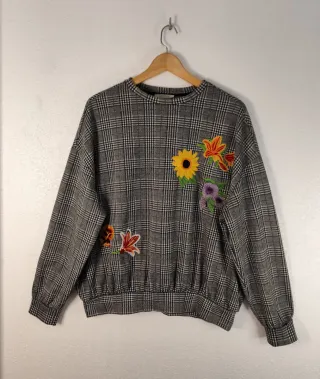 Sudadera con estampado de cuadros y apliques florales. - Diseño de cuadros en tonos grises. - Flores bordadas en la parte delantera. - Puños y bajo elásticos.