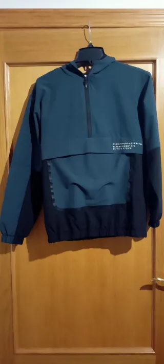 Sudadera con capucha y bolsillo frontal de Zara. Diseño moderno en color verde y negro.Talla 13-14 - Cierre de media cremallera. - Bolsillo tipo canguro. - Puños y bajo elásticos.