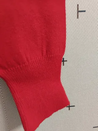 Jersey de punto fino en color rojo, ideal para añadir un toque de color a tu armario. Presenta un diseño clásico con cuello redondo y puños con detalle de botones dorados en forma de corazón. - Manga larga. - Puños con botones dorados. - Bajo elástico.
