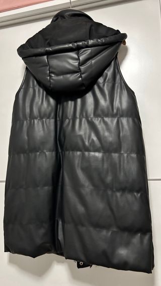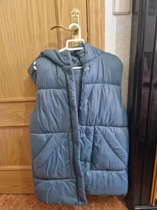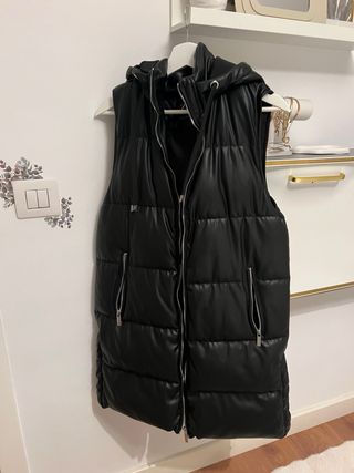 Chaleco largo y abrigado con capucha. - Cierre de cremallera. - Bolsillos laterales con cremallera. - Botones a presión en la parte frontal.