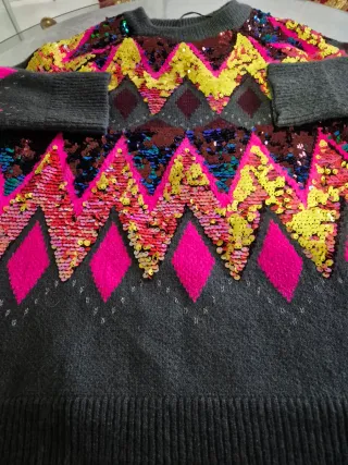 Jersey de punto con un diseño llamativo de lentejuelas. - Mangas largas. - Cuello redondo. - Detalle de rombos y zig-zag con lentejuelas. - Base y puños de punto. - Efecto brillante y colorido.