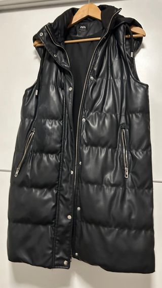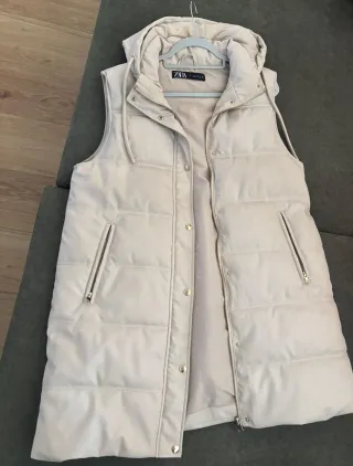 Chaleco acolchado de la marca ZARA, con un diseño moderno y práctico. - Capucha integrada. - Cierre de cremallera. - Bolsillos frontales con cremallera.