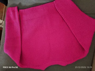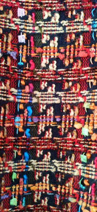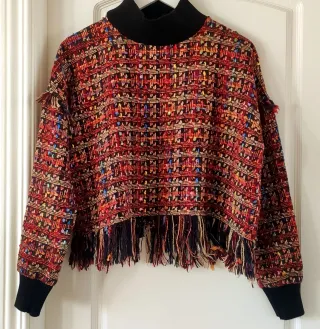 - Tejido tipo tweed. - Cuello alto. - Mangas largas. - Bajo con flecos. Ancho 60 cm Largo desde el hombro hasta los flecos 48 cm (sin incluir flecos) Largo de los flecos aprox 8 cm