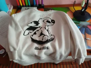 Sudadera blanca con estampado de Stitch. - Diseño divertido con el personaje de Stitch. - Cuello redondo y mangas largas. - Puños y bajo elásticos.