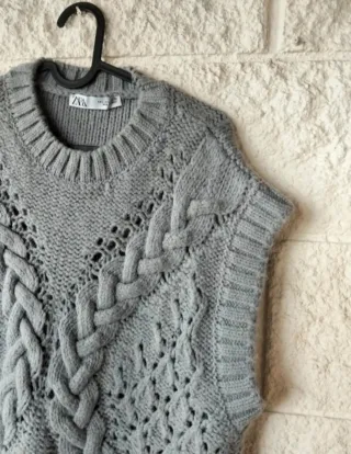 Chaleco de punto grueso con un diseño de trenzas y calados. Talla L, acrílico. Color gris. Muy gordito. Medidas en las fotos.