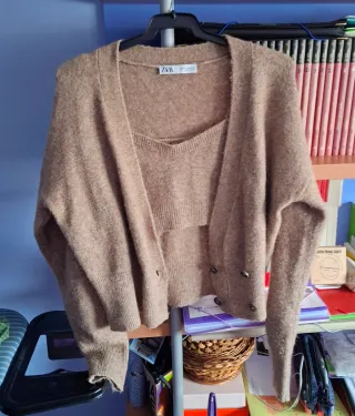 Conjunto de dos piezas de cárdigan y top de punto. - Cárdigan con botones. - Diseño de dos piezas. Conjunto de cárdigan de punto con botones y doble botonadura en marrón de Zara y suéter. Cárdigan y Top de punto con botones cruzados. Cárdigan con cuello en V y manga larga talla M. Top con escote en V y tirantes anchos talla S. Color marrón. Marca Zara.