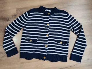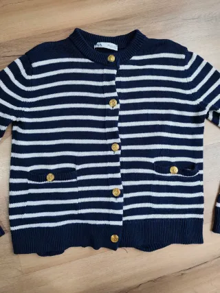 Cárdigan de punto con un diseño clásico de rayas marineras. Es una prenda versátil y cómoda. PONE TALLA S PERO ES AMPLIA PARA TALLA M/38 - Diseño de rayas horizontales en azul marino y blanco. - Cierre de botones dorados. - Dos bolsillos delanteros con detalle de botón. - Cuello redondo.