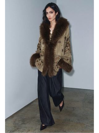 Chaleco de pelo sintético de Zara, con un diseño moderno y cálido. - Material suave y agradable al tacto. - Color marrón y beige, versátil para combinar. - Ideal para añadir un toque de estilo a cualquier atuendo.